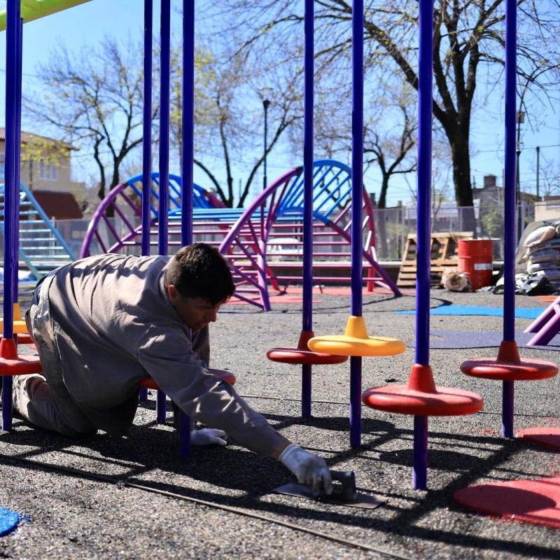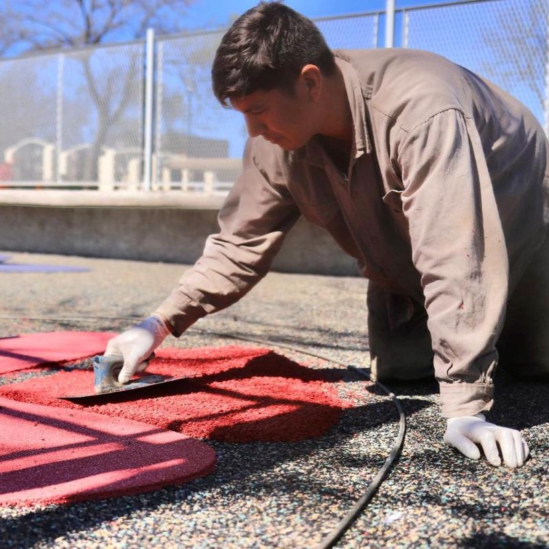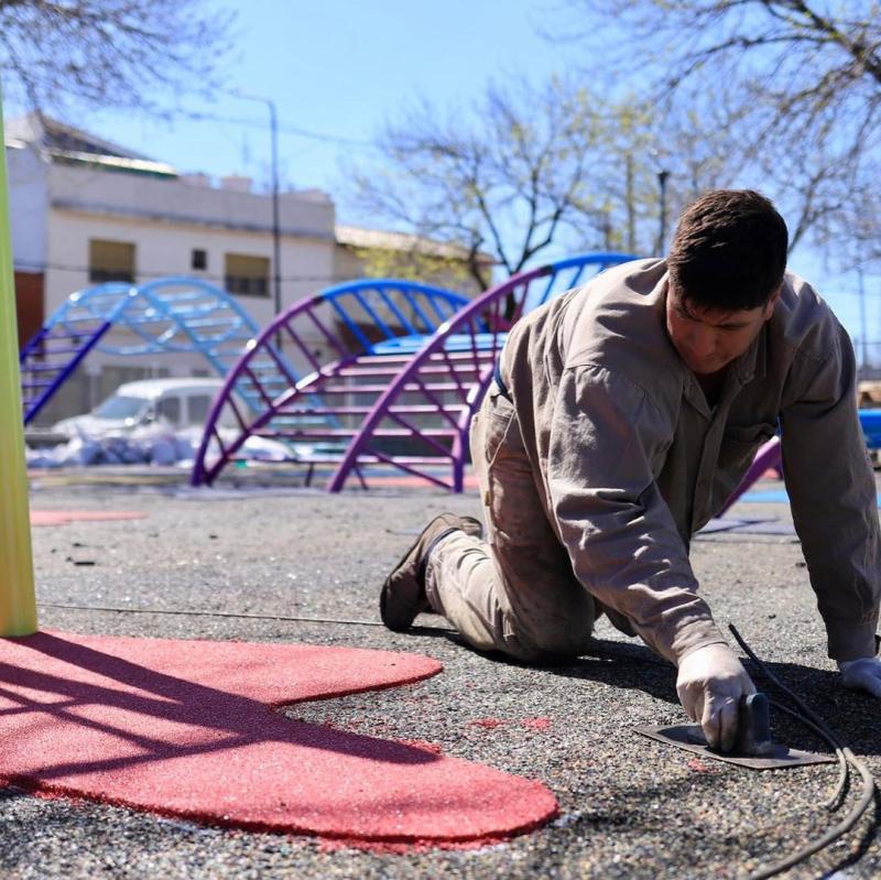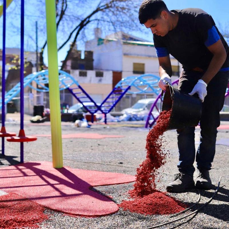 Instalación de pavimento continuo de caucho reciclado de varios colores, En la plaza Alem en Lanús, En el sector de niños en juegos infantiles