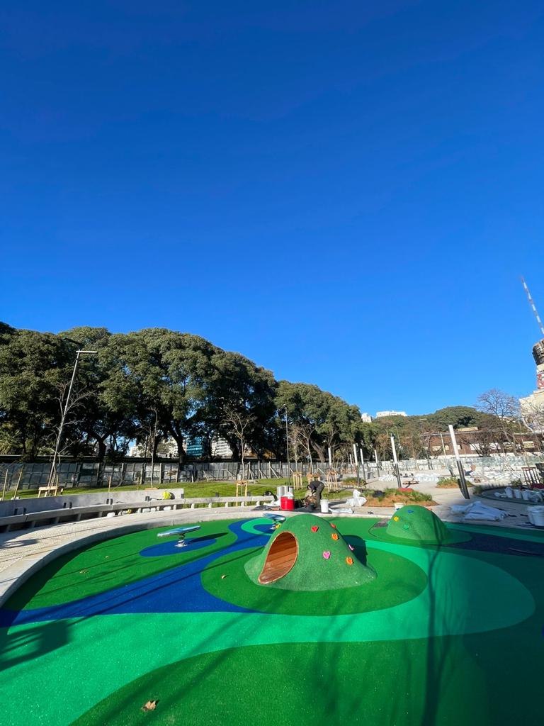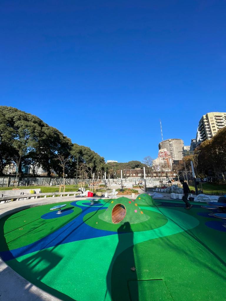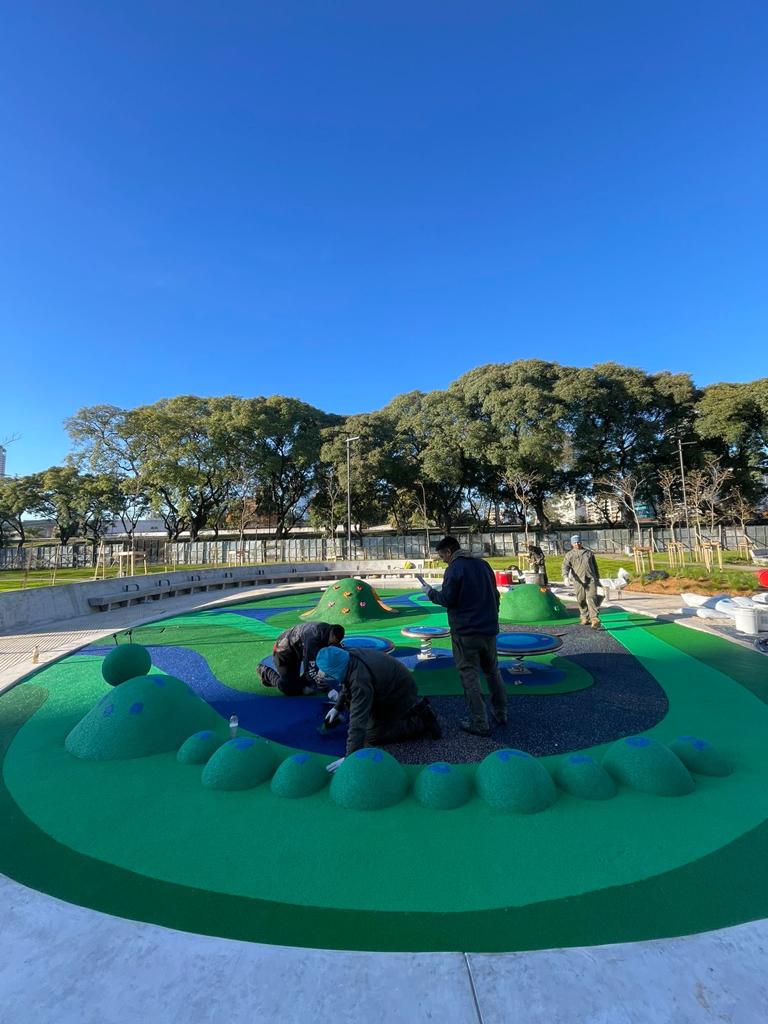Pavimento de caucho reciclado instalado insitu con varios diseños y colores en sector de juegos infantiles en Plaza Cañitas en Palermo Ciudad Autónoma de Buenos Aires